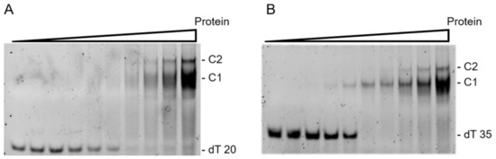 Most bacterial SSBs have different binding modes for ssDNA of various lengths [7]. To investigate the binding mode and affinity of LjSSB for ssDNA, we performed gel shift assay (EMSA) using different concentrations of purified LjSSB (0–32 μM) and 20- and 35-mer oligonucleotides consisting of deoxythymidine (dT20 and dT35, respectively). As shown in Figure 3A, when LjSSB was incubated with dT20, intensity of the unbound DNA band decreased, but no significant band shift was observed at a low protein concentration (lanes 3 to 5 in Figure 3A). This result suggested that a low concentration of LjSSB may not form a stable complex with dT20. Nevertheless, at an LjSSB concentration of 1 μM (lane 7 in Figure 3A), a significant band shift was observed, indicating that LjSSB formed a single complex with dT20. Furthermore, when the LjSSB concentration was increased (lanes 8–10 in Figure 3A), another slow-migrating band appeared. This slow migrated second band indicated that LjSSB formed a second complex with dT20 under a high concentration of protein. At least two LjSSB tetramers may be involved per oligonucleotide, despite the short length of dT20. This phenomenon was also observed in LjSSB incubated with dT35 (Figure 3B). At low concentrations of LjSSB, 0.5 to 2 μM (lanes 4 to 6 in Figure 3B), a single complex was observed, whereas a second complex was detected under high concentrations of protein (lanes 8 to 10 in Figure 3B). The EMSA results for dT20 and dT35 with LjSSB indicated that LjSSB forms two types of complexes with dT20 and dT35 according to protein concentration, which was a distinctive feature from other SSBs, that had C-termini and formed only a single complex with short ssDNA [30,31]. When other SSBs with C-terminal domains were incubated with short ssDNA (15–40 nt), only a single complex was detected, contrary to the observed results for LjSSB. These different features of LjSSB are considered to derive from the absence of a C-terminal domain because the IDL and acidic tip of the C-terminal domain are involved in mediating ssDNA binding [32,33].