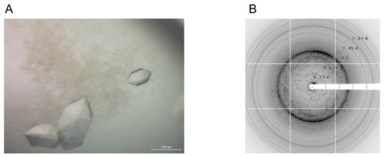 To obtain structural information on LjSSB, crystallization screening and X-ray diffraction experiments were performed. The crystallization conditions of LjSSB were screened using more than 1000 different crystallization buffers. The best single crystal was obtained under 0.1 M of phosphate-citrate pH 4.2 and 1.6 M of NaH2PO4/0.4 M K2HPO4 (Figure 4A). To prevent freezing damage, the single crystals were soaked in a cryoprotectant, perfluoropolyether oil PFO-X175/08. Subsequently, X-ray experiments were performed by mounting the samples under a liquid nitrogen stream. The 360 frames of the diffraction images were collected at a resolution of approximately 2.6 Å (Figure 4B). The acquired diffraction data were indexed, integrated, and scaled using the XDS program [23]. The crystal belongs to the orthorhombic space group C222, with the unit cell parameters a = 106.58 Å, b = 234.14 Å, c = 66.14 Å. Molecular replacement was performed for phase determination using MOLREP [34] and Phaser [35]. The initial structure of LjSSB was determined using EcSSB (PDB code: 1KAW) as a reference model. Refinement and model building are currently underway using the Phenix [36] and COOT software programs [37].