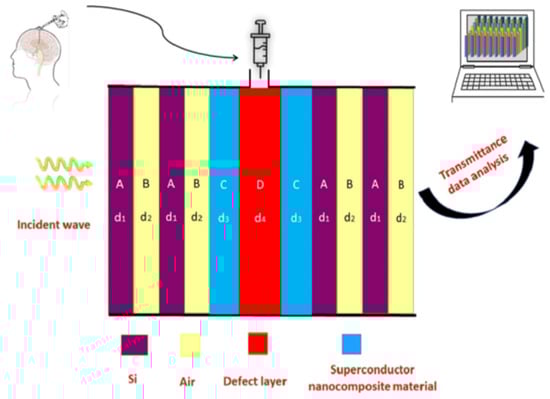 The proposed 1D DPhC (AB)NCDC(AB)N capable of detecting cancerous brain tissues is depicted in Figure 1. Here, A and B represent alternating layers of two identical 1D PhCs (AB)N of period N used in the design. These two PhCs are joined together through air cavity D coated with nanocomposite material C as depicted in Figure 1. The cerebrospinal fluid (CSF) samples containing different brain tissues extracted from various parts of the human brain through a long needle have been injected into the cavity region of the structure to perform investigations as per requirement. The process of collecting samples from the human brain is called a lumbar puncture [1,2].