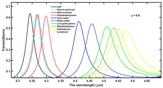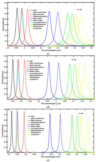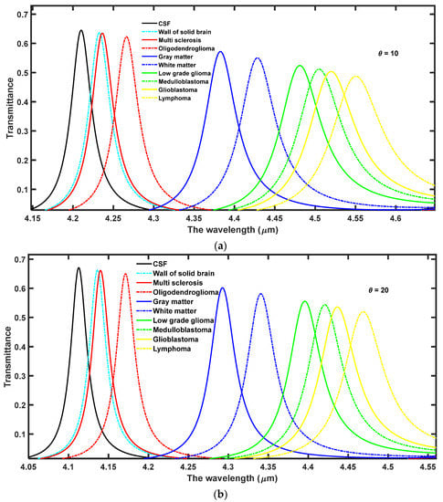 In order to carry out investigations pertaining to this research, we have infiltrated the cavity region of our 1D DPhC structure (AB)2CDC(AB)2 with different samples containing brain tissues as per the information given by Biswas, T. [31], separately to identify the nature of the malignancy in these samples. For achieving the objective of the proposed work we have studied the transmission spectra of 1D DPhC structure (AB)2CDC(AB)2 dependent on two external factors, first, change in incident angle and the second change in the ambient temperature of nanocomposite superconducting material layer. The research has been conducted in the infrared region of the electromagnetic spectrum which extends from 3.2 µm to 4.7 µm. Figure 2 depicts the transmission spectra of proposed biosensor (AB)2CDC(AB)2 at a normal incidence with d4 = 15dd and η = 0.8. It shows ten distinguishable defect mode peaks centered at different positions inside PBG which extends from 4.15 µm to 4.7 µm corresponding to ten separate samples containing different brain tissues as per the details given by Biswas, T. [31]. The intensity of these peaks gradually varies between 65% to 45% corresponding to samples containing brain tissues separately from CSF to lymphoma, respectively. The intensity of these defect modes is sufficient to be detected by spectrometer through optical fiber into a computer with the help of software. The larger refractive index contrast between silicon and air layers of the 1D DPhC results in a wider PBG width of 0.6 µm. The change in the analyte into the cavity region from CSF to Lymphoma as given by Biswas, T. [31] one by one results in the movement of defect mode inside PBG towards a higher wavelength with a gradual decrease in the intensity of the respective defect mode as shown in Figure 2. This shifting of defect mode inside PBG is measured with reference to the position of defect mode corresponding to the CSF sample. The standing wave formulation inside the laser cavity can be used to justify the movement of defect mode inside PBG as given in Equation (9). The change in the refractive index of the analyte under investigation alters the resonant condition which governs laser radiation from the cavity by fixing the optical path difference inside the laser cavity.