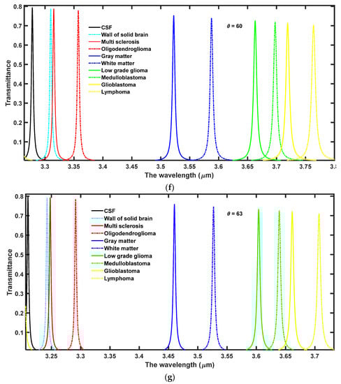 The transmittance spectra of 1D DPhC (AB)2CDC(AB)2 infiltrated with ten different samples containing brain tissues with d4 = 15dd and η = 0.8 corresponding to oblique incidence at (a) θ = 10°, (b) θ = 20°, (c) θ = 30°, (d) θ = 40°, (e) θ = 50°, (f) θ = 60° and (g) θ = 63°.