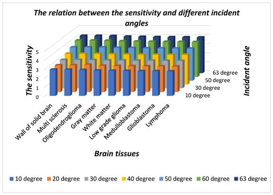 As evident from Figure 3 the increase in the angle of incidence from 0° to 63° results in the blue shift of defect modes associated with each sample. Moreover, this increase in incident angle also reduces the full-width half maximum (FWHM) of each resonant mode inside PBG which in turn improves the intensity of each defect mode by fulfilling the law of conservation of energy. Actually due to an increase in the angle of incidence the energy associated with each defect mode remains constant inside PBG. The optimum value of angle of incidence has been found to be θ = 63° at which the sensitivity of the proposed design varies between the maximum value of 4.13924 µm/RIU to the minimum value of 3.9523 µm/RIU corresponding to samples containing a wall of the solid brain to lymphoma brain tissues, respectively. Thus the increase in the incident angle results in a significant improvement in the sensitivity of the proposed structure in contrast to the results of Figure 2 at θ = 0°. The increase in the angle of incident improves the interaction between the sample under investigation and light. This interaction improves the resonance between the standing waves inside the cavity region which results in the reduction of FWHM with an enhanced intensity of defect mode associated with each sample containing different brain tissues. Thus, by increasing the incident angle one can improve the performance of the proposed design composed of 1D DPhCs. The angle dependent sensitivity and central wavelength of defect modes associated with samples containing various brain tissues separately are summarized in Table 2. The pictorial representation in three-dimensional bar graph of the data presented in Table 2 is shown in Figure 4 below.