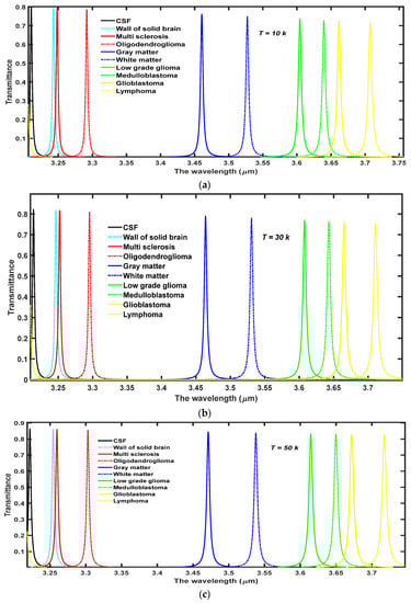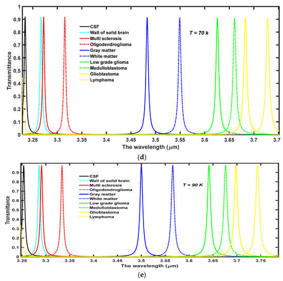 Finally, we have studied the effects of increasing the temperature of nanocomposite buffer layers made up of the high temperature superconductor YBa2Cu3O7, in which the dielectric material SiO2 is embedded. The performance of our proposed structure has a cavity thickness of d4 = 15 dd, and a volume fraction of SiO2 material embedded into the nanocomposite buffer layers and at . We wish to improve the intensity of defect modes inside PBG by increasing the ambient temperature T of the buffer layers. For this purpose, we have studied the effect of increasing the ambient temperature of superconducting material layers to T = 10 K, 30 K, 50 K, 70 K, and 90 K, on the transmission spectra of the proposed design loaded with different samples containing brain tissues extracted from various parts of the brain, as shown in Figure 5a–e, respectively. This range of temperature has been selected keeping the critical temperature (Tc = 92 K) of the superconducting material into account. Moreover, it is the experimentally observed fact by Marel et al. that YBa2Cu3O7 shows the critical reflectivity below Tc in the infrared region of the electromagnetic spectrum which is in agreement with the two fluid model of superconductors [31]. It has been observed that the increase in temperature results in the moderate shifting of defect modes towards higher wavelength side inside PBG. The increase in T increases λL, which is a function of T as evident from Equation (2) which in turn also increases the refractive index of superconducting material. Due to the increment in the refractive index value of superconductor material the refractive index contrast between the layers of the structure reduces which leads to the shifting of PBG towards the higher wavelength side. This shifting of PBG also triggers the red shifting of defect modes which are located inside PBG and are associated with different samples as evident in Figure 5. The increase in temperature also improves the transmission intensity of each defect mode associated with each sample which reaches the maximum (close to unity corresponding to all samples) at T = 90 K though the FWHM of each defect mode remains stagnant. The numeric values of the central wavelength of defect mode (λd), percentage transmittance of defect mode (Trans.) and sensitivity (S) of the proposed structure (AB)2CDC(AB)2 are associated with different samples containing brain tissues of various parts of the brain have been listed in Table 3 corresponding to different ambient temperatures of nanocomposite layers. Moreover, the increase in the temperature of the ambient medium of the superconducting buffer layers decreases the superconducting electrons (ns) of the material, which in turn increases the number of normal electrons (ne) of the superconducting material. The superconductor is transformed into normal material when the ambient temperature exceeds the critical temperature of the material due to the presence of a large number of ne in comparison to ns in the superconducting material. This effect has not been included in this study because the present structure will be transformed into conventional PhC and has already been discussed by many researchers working in this field.