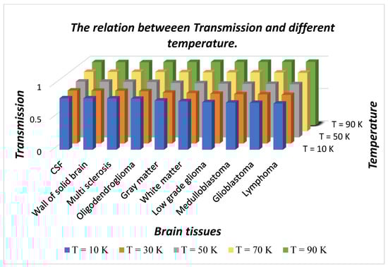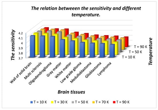 The numeric data of Table 3 have been visualized with the help of Figure 6 and Figure 7. Figure 6 and Figure 7 have been plotted to depict a 3D bar graph showing temperature dependent sensitivity of the proposed design and transmittance of defect mode associated with different fluid samples containing brain tissues respectively, as per the information given in Table 3. Figure 6 shows as T increases from 10 K to 90 K in steps of 20 K, the sensitivity of the design varies between a maximum value of 4.12658 µm/RIU to a minimum of 3.95071 µm/RIU corresponding to a sample containing a wall of the solid brain and lymphoma brain tissues, respectively, at T = 10 K. Further increases in temperature gradually reduces the sensitivity corresponding to each sample under investigation. The sensitivity variation lowers down between a maximum of 4.07594 µm/RIU to a minimum of 3.89189 corresponding to separate samples containing walls of solid brain and lymphoma brain tissues, respectively, at T = 90 K. This reduction in sensitivity is due to the increase in the number of ne in contrast to the number of ns with an increase in ambient temperature. It has been also noticed in Figure 6 that the sensitivity of the structure varies between maximum to minimum values corresponding to samples containing walls of solid brain and lymphoma brain tissues, respectively, at all temperatures.
