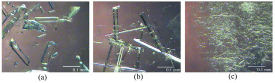 According to the Q3C guideline for residual solvents [34], a systematic polymorph screening of BXM was performed by recrystallization from several organic solvents at variable conditions. The identity and purity of the prepared solid forms were verified by PXRD (Table S1 in the Supplementary Materials). Through the screening process, BXM was found to crystallize in three crystal forms, named ‘Form I’, ‘Form II’, and ‘Form III’. Forms I and II, prepared by the solvent evaporation method, were crystallized and suitable for single-crystal X-ray diffraction analysis (Figure 1a,b). Despite all our efforts, the structure solution of Form III was not successful thus far because of the small size and poor quality of the crystals. Crystal size and quality were unable to be improved upon, as it was obtained only by stir precipitation (Figure 1c).