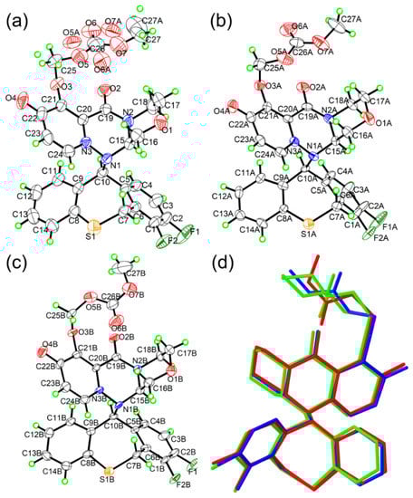 The ORTEP figures of (a) Form I, (b) molecule A of Form II, and (c) molecule B of Form II drawn at the 50% probability level. H atoms are shown as small spheres at a 0.15 Å radius. (d) Superposition of the BXM in I (green), molecule A (red), and molecule B (blue) in II. Hydrogen atoms were omitted for clarity.