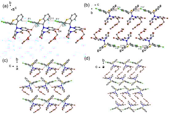 (a) 1D chain constructed by C11-H11…F1 and C7-H7B…O4 interactions run parallel to the c-axis in Form I; (b) 1D chain constructed by C11-H11…F1 interactions run parallel to the c-axis in Form II; (c) view of the three-dimensional packing of Form I (viewed along the a-axis direction); (d) view of the three-dimensional packing of Form II (viewed along the a-axis direction).