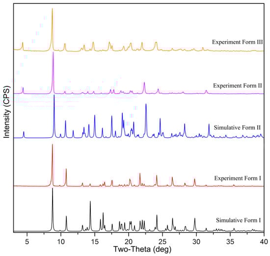 The excellent accordance between the experimental and crystal structure simulated PXRD patterns of Form I and II corroborated the identity of the precipitated powder (Figure 4). The major characteristic PXRD peaks of Form I appear at 2θ values of 8.7°, 10.8°, 14.3°, 17.5°, 21.6°, 24.1°, 26.4°, and 29.7°. Form II showed the peaks at 2θ values of 4.4°, 8.9°, 11.7°, 14.0°, 17.8°, 22.3°, 24.3°, and the characteristic peaks of Form III are at 2θ values of 4.3°, 8.7°, 10.6°, 13.4°, 17.1°, and 22.0°. Specifically, Form II has distinctive peaks at 11.7°, 14.0°, 22.3°, and 24.3° that are absent in Form III (Figure S2).