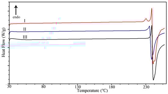 DSC curves of BXM in Form I, Form II, and Form III at a 10 °C/min heating rate.
