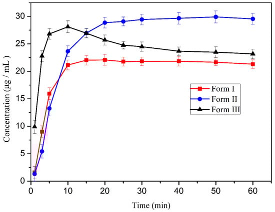 The powder dissolution behaviors of the BXM polymorphs determined in pH 1.2 simulated gastric fluids at 37 °C are demonstrated in Figure 6. Form III was dissolved faster than Form I and II at the first stage. After 10 min, the solubility of Form III displays a “spring and parachute” effect [38]. With increasing time, BXM concentration in solution decreases, and after 40 min, the concentration is close to that of Form I, indicating that the precipitation process (Form I) is happening, and Form III converts into less soluble Form I under suspension condition. In addition, Form II presents an extreme increase in solubility when compared with Form I. The Smax values of II and III are 1.4 and 1.3 times as high as that of Form I. After the dissolution study, the remaining solid phase was characterized by PXRD analysis (Figure S10). It was confirmed that Form III almost converted to Form I as expected, while Form I and II retained their respective crystal forms, and there is no change even if suspended in water for seven days. The equilibrium solubility of Form I and II was 21.2 ± 0.2 and 29.4 ± 0.4 μg/mL, respectively. All three polymorphs have been shown to be as stable on the shelf for 12 months under the conditions of 25 ± 2 °C and 60% RH ± 5% RH (relative humidity) (Figure S11). The particle size is an important factor in the dissolution behavior of the API [39]. Therefore, to exclude the impact of particle size on the dissolution, crystals of a similar size range were used in the experiment. Thus, the difference in dissolution behavior between BXM polymorphs, especially for Form I and II, is due to the differences in the molecule packing rather than the particle size of the material studied.