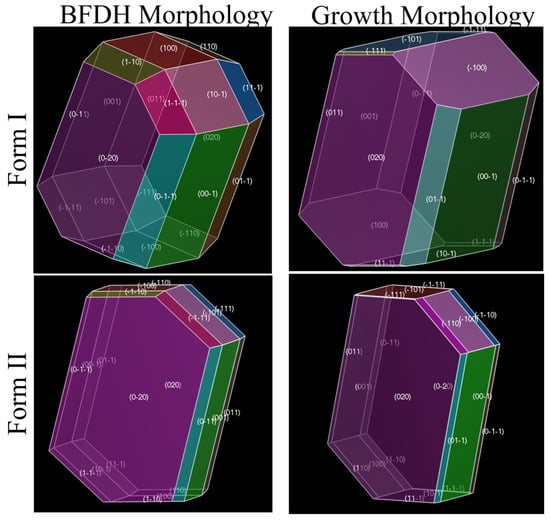 The BFDH and growth morphology of Form I and II. The morphologically important faces are evidenced together with their Miller indices.