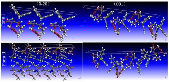 There has been an increasing interest in the correlations between the crystal structure, crystal morphology, and physicochemical properties of an investigational pharmaceutical compound [22,40]. Crystal morphology plays an important role in the dissolution behavior of drugs, depending on the functional groups exposed on the surface [41,42,43]. The theoretical crystal morphology of Form I and II was simulated by the Bravais-Friedel-Donnay-Harker (BFDH) model and growth morphology (GM) models with the aid of Materials Studio [38] (Figure 7, Table S4). By comparing Figure 7 and Figure 1a,b, it can be seen that the simulated morphologies are similar to the crystal habit of the experimentally obtained crystals, but there are still some differences because the simulated morphologies only predict the crystal habit from the perspective of the internal structure of the crystal itself and do not consider the influence of the external environment on the crystal growth. The crystal habit obtained in the actual crystallization process is simultaneously affected by the combined effects of thermodynamics and kinetics. Therefore, the actual crystal habit obtained under different crystallization conditions may be different from the theoretical crystal habit calculated by the model. Vacuum morphology of Form I and II was generated by the BFDH model. The benefit of this method was to identify important faces in the growth process [44]. Results show that (0–20), (001), (0–11), and (100) are among the major surfaces, with (0–20) being the most dominant face. The calculated aspect ratio by BFDH morphology for Form I and II was 1.778 and 3.254, respectively. Surface structures of all important facets of Form I and II given by the MG model were studied. For Form I, (0–20) occupies 35% of the surface area and exhibits an attachment energy (Eatt) value of −47.906 kcal/mol, while for Form II, (0–20) occupies 62% of the surface area and exhibits an Eatt value of −31.244 kcal/mol. Because of the structural dissimilarity as described earlier, the orientation of molecules on the exterior of each facet of a crystal was diverse. For Form I, the (0–20) facet has a bed of phenyl moieties, making it relatively more hydrophobic (Figure 8 and Figure S4), while, in Form II, the exposure of methymethyl carbonate chain makes it more hydrophilic (Figure 8 and Figure S5). Thus Form II has a much greater percentage of its surface area with exposed hydrogen bond acceptors than Form I. Since the solubility and dissolution rates are proportional to the polarity of the crystal surface [45,46], the bulk solubility in aqueous media is much greater for Form II than for Form I.