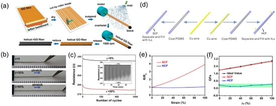 (a) Schematic of the fabrication procedures of helical GO and rGO fibers; (b) photographs of helical rGO fibers under strains of 30% and 60%; (c) oscillation of resistance at two different strain levels over 1000 cycles; Reprinted with permission from Ref. [62]. 2016, Royal Society of Chemistry (d) schematic of preparation process of the straight conductive fiber (SCF) and helical fiber (HCF); (e) the relative resistance changes; and (f) gauge factors of the SFC and HCF vs. strain. Reprinted with permission from Ref. [64]. 2018, American Chemical Society.