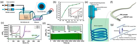 The coaxial wet-spinning assembly method has been proposed to produce polyelectrolyte-covered graphene fibers. For example, a one-step coaxial wet-spinning assembly method was developed to prepare silicone elastomer-coated CNT core-sheath fibers as wearable strain sensors, as depicted in Figure 3a [66]. By augmenting the CNT content, the conductivity was enhanced by several orders of magnitude, suggesting that a continuous conductive network was formed (Figure 3b). The obtained fiber strain sensors were found to have a tolerable strain of >300% and a gauge factor of 1378 (Figure 3c). Higher CNT content also gave rise to a slower resistance change under strain. In addition to high stretchability, outstanding stability was achieved simultaneously, evidenced by the reversible resistance change over >10,000 cycles. Benefiting from the bending- and torsion-insensitiveness, coaxial fiber strain sensors could precisely detect subtle human motions. Through a coaxial wet-spinning process, Zhou et al. [67] fabricated a fiber-based strain sensor in a core–sheath configuration consisting of a thermoplastic elastomer (TPE) wrapped with CNTs, as depicted in Figure 3e,f. The fragmentation of the coaxial fiber was observed during stretching (Figure 3g), implying good load transfer efficiency between the CNT core and the TPE matrix, and could be nearly recovered upon unloading. Such cracks are critical to the stretchability of the fibers and allow the linear resistance response. The consequent fiber sensor had a high sensitivity (~425) for the strain range up to 100%, as well as high mechanical stretchability and stability, showing great potential as the sensing components in wearable textiles.