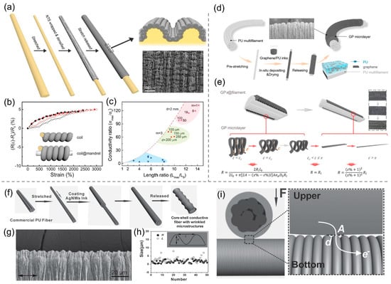 (a) Fabrication procedures of a conductive core–sheath fiber with long- and short-period wrinkles shown in SEM images; (b) resistance change vs. strain for coiled fibers; (c) comparison of the conductivity ratio vs. the ratio of maximum stretched length to initial length; Reprinted with permission from Refs. [72,73]. 2015, American Association for the Advancement of Science; 2016, Wiley-WCH. (d) schematic of the preparation of worm-shaped filaments; (e) geometrical model of the graphene and PU layer on fibers; Reprinted with permission from Ref. [74]. American Chemical Society 2019. (f) preparation of stretchable core–shell fibers with wrinkled microstructures; (g) SEM images showing the wrinkled microstructures; (h) distribution of the sizes of the wrinkled microstructures; and (i) schematic presenting the sensing mechanism. Reprinted with permission from Ref. [75]. 2016, Wiley-WCH.