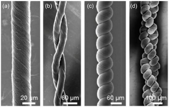 SEM images showing CNT yarns with different configurations, including: (a) single CNT yarn, (b) two-ply CNT yarn, (c) coiled CNT yarn, and (d) two-ply coiled CNT yarn. Reprinted with permission from Ref. [78]. 2020, Wiley-WCH.