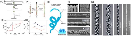In the reminiscence of the supercoil conformation of DNA in a twist of a double helical axis, the supercoiled fibers were prepared by overtwisted insertion of spandex fibers wrapped in CNT-spun sheet with surface wrinkles, as shown in Figure 8e,f [83]. Typically, the first-coiled yarns can only sustain < 400% strain, while two-ply coiled yarns were observed to have a stretchability of 800% [84]. Son et al. found that, as supercoiled yarn had a highly compact and ordered structure, a large amount of elastic strain energy could be stored in the fiber, enabling the fiber to show a superelasticity of ~1500% without significant electrical fracture. As show in Figure 8g, during the stretching process, the yarn mainly experienced gradual opening of first coils at the low strain range (<450%) and the supercoils. At the higher strain levels (>450%), the wrinkled structures tended to be unfolded which further contributed to the stretchability of yarns.