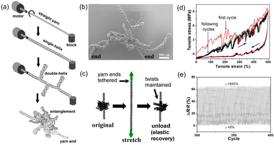 In addition to the coiled or double-helix yarns with relatively regular configurations, extreme overtwisting can produce entangled CNT yarns with a higher complexity [85]. As shown in Figure 9a, with increasing overtwisting, the straight yarn gradually self-assembled into single-helix and then double-helix structures and finally developed random at multiple sites along the yarn axis while intertwining to generate amorphous configurations. An aggregation containing multiple self-interlocked twists were eventually generated, as shown in Figure 9b. Such an entangled yarn structure was highly stable and could be stretched to 500% strain (Figure 9c), with no change of resistance when disentangled. According to the stress–strain curves in Figure 9d, multiple stress peaks were visible, corresponding to the resolving events of the double-helix segments within the entanglement. In addition to the large sensing range, the entangled coiled CNT yarn presented a cyclic stretching–releasing stability at 500% strain for 600 cycles, as depicted in Figure 9e. The configuration dependent sensing performance of conductive yarns are summarized in Table 2.