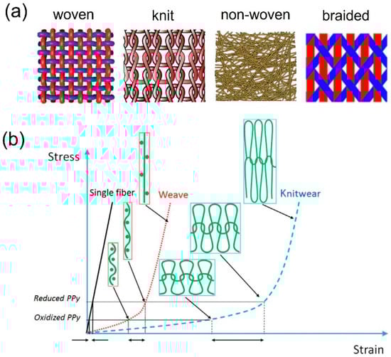 (a) Illustration of different fabric patterns; Reprinted with permission from Refs. [7,89]. 2020, Wiley-WCH; 2013, Elsevier, and (b) stress–strain characteristics of the fabric materials, including single fiber, woven fabric, and knit fabric. Reprinted with permission from Ref. [88]. 2015, American Association for the Advancement of Science.