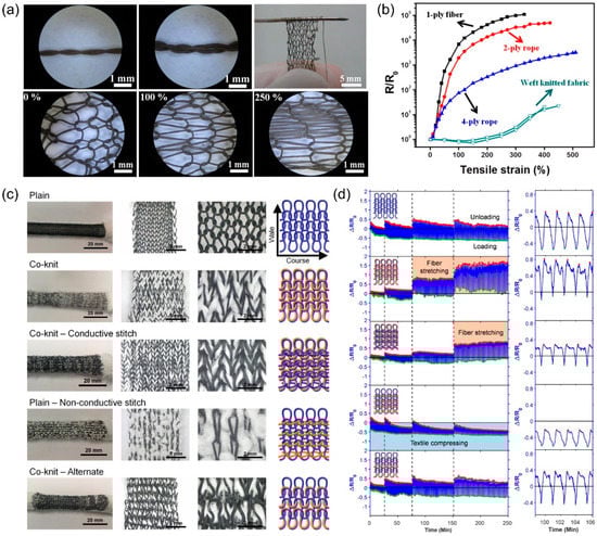 (a) Optical images of the two-ply, two-ply rope, and knitted fabric before and after stretching; (b) the plot of normalized resistance vs. tensile strain; Reprinted with permission from Ref. [99]. 2014, American Chemical Society. (c) photographs, optical images, schematics; and (d) strain sensing behaviors of different knitted structures based on PU/PEDOT:PSS filaments. Reprinted with permission from Ref. [100]. 2018, Elsevier.