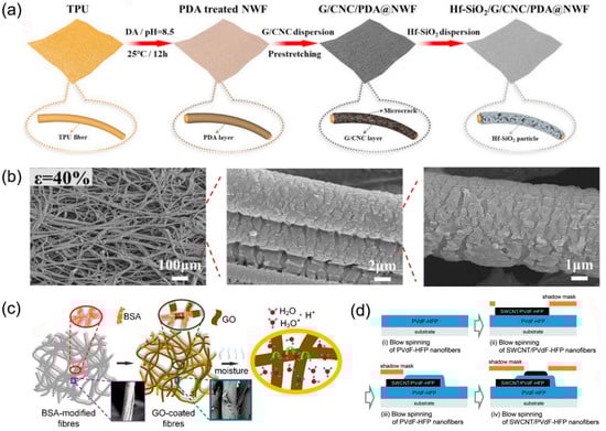 By coating the conductive cellulose nanocrystal and graphene on the thermoplastic polyurethane (TPU) NWF, a flexible strain sensor having large sensing range and high sensitivity was successfully fabricated [101]. In particular, polydopamine (PDA) was used to treat the fabric firstly to strengthen the interface between the coating and fabric, and subsequent immersion in hydrophobic-fumed silica (Hf-SiO2)/ethanol dispersion granted the fabric with superhydrophobicity (Figure 13a). The as-prepared composite NWF sensor was based on a micro-crack sensing mechanism, as shown in Figure 13b. As a consequence, NWF sensor with denser cracks presented a lower gauge factor and a wider sensing range. When the graphene content was 25 wt%, a broad working range (98%), a low detection limit (0.1%), short response time (33 ms), and good durability over 1000 cycles were obtained simultaneously. Furthermore, the superhydrophobicity of NWF strain sensor enabled great waterproofness and hence corrosion protection and self-cleaning ability. In another study, Wang et al. [102] reported a GO-coated NWF humidity sensor. Likewise, bovine serum albumin (BSA) was introduced as an interfacial layer to allow more GO absorbed on the NWF (Figure 13c). The as-obtained sensor exhibited a fast response recovery to achieve high sensitivity, which favors its application in the detection of human respiration. Cho et al. [103] demonstrated the fabrication of conductive NWF through blow spinning of PVDF-HFP blended with CNTs, as shown in Figure 13d. The NWF sensor showed a high gauge factor of 134, a detectable strain of as low as 0.03%, and good mechanical stability within 1000 cycles. The brief summary of the fabric patterns and corresponding output performance of textile-based sensors can be seen in Table 3.