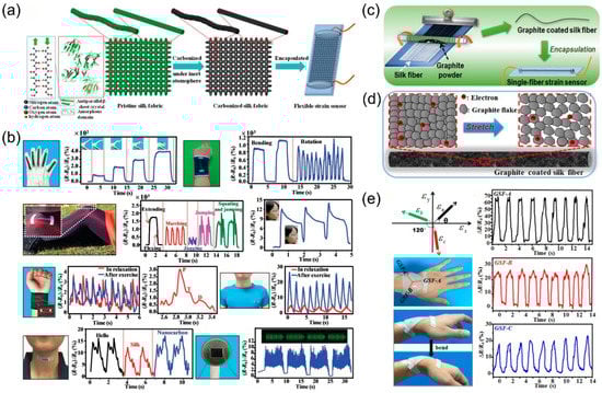 (a) Illustration showing the hierarchical structures and the fabrication of carbonized silk fabrics strain sensors; (b) detection of various human motions and sounds using the wearable carbonized silk fabrics strain sensors; Reprinted with permission from Ref. [109]. 2016, Wiley-WCH. (c) fabrication of sheath–core structured graphite and silk strain sensors through a dry-Meyer-rod-coating process; (d) schematic illustration of the sensing mechanism; and (e) integrated rosette-shaped GSF strain senor for multidirectional motion detection. Reprinted with permission from Ref. [111] 2016, American Chemical Society.