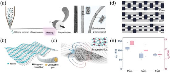 - Zhao, X.; Zhou, Y.; Xu, J.; Chen, G.; Fang, Y.; Tat, T.; Xiao, X.; Song, Y.; Li, S.; Chen, J. Soft fibers with magnetoelasticity for wearable electronics. Nat. Commun. 2021, 12, 6755. [Google Scholar] [CrossRef] [PubMed]