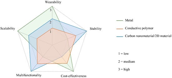 The first step for the design of wearable electronics is the selection of building blocks, which are able to afford outstanding mechanical properties without sacrificing electrical performance. In recent years, a variety of conductive materials have been extensively used to build electronic textiles, such as metal and metal oxide (nanoparticles, nanowires, and nanorods) [15,16], conductive polymers [17,18], and carbon nanomaterials (carbon nanotubes, graphene) [19,20,21,22,23,24].