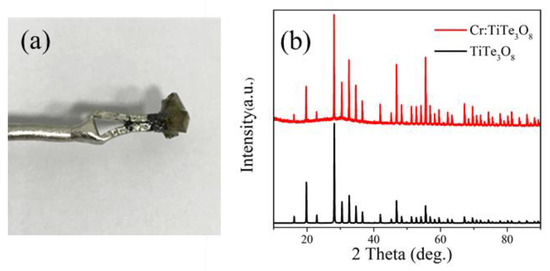 (a) Polycrystals obtained by spontaneous nucleation; (b) XRD patterns of Cr:TiTe3O8 and the pure TiTe3O8.