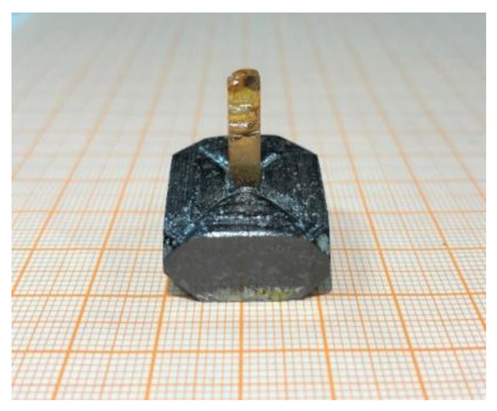 The Cr:TiTe3O8 crystal was grown using flux method by slowly temperature dropping for a month. A piece of directional crystal seed cut along the [100] axis was used. Finally, a single crystal 21 mm × 21 mm × 11 mm in size was obtained, as shown in Figure 2. It has a square shape from top to bottom. The Cr:TiTe3O8 crystal exhibits a dark green color.
