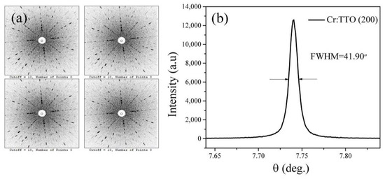 The single crystal orientation was determined by the back-beam Laue method. Four points on a 5 mm × 5 mm × 1 mm wafer were randomly selected, and the related Laue diffraction images are shown in Figure 3a. Each diffraction spot was clear and symmetrical without splitting and had good axial symmetry. The X-ray rocking curve of Cr:TiTe3O8 wafer (200) diffraction plane is shown in Figure 3b. It can be seen that the FWHM (full width at half maximum) is as low as 41.90 arcsec, and the peak is symmetrical and sharp. Both the Laue photograph and X-ray rocking curve measurements indicate that the crystal is of good quality.