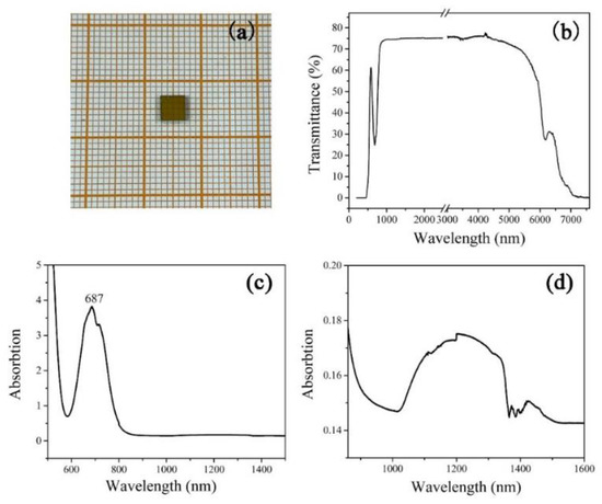(a) A Cr:TiTe3O8 crystal wafer with dimensions of 5 mm × 5 mm × 1 mm; (b) transmission spectra of the Cr:TiTe3O8 single crystal perpendicular to the (100) plane; (c) the absorption spectrum of the Cr:TiTe3O8 crystal; (d) the magnified absorption spectrum at 1 μm.