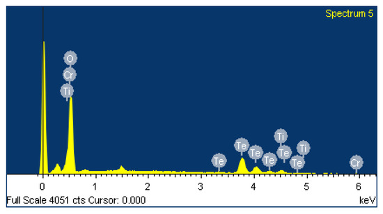 The chemical composition of Cr:TiTe3O8 crystal was determined using EDS technique, and the recorded spectrum is shown in Figure 5. The elemental mapping proves the presence of Te, O, Ti and Cr elements in the crystal. EDS test can only be used for semi-quantitative analysis. In order to quantitatively analyze the concentration of Cr element in the crystal, the XRF test was carried out. The result is shown in Table 1. The molar percentage of Cr element is determined to be 4.9%.