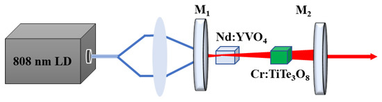 In this section, the Cr:TiTe3O8 single crystal was tried to use as a saturable absorber in the laser operating. The schematic diagram of the experimental setup is shown in Figure 6. A Cr:TiTe3O8 crystal in size of 4 mm × 4 mm × 1 mm and a Nd:YVO4 crystal in size of 3 mm × 3 mm × 10 mmwere inserted into a 30 mm long resonant cavity. The Nd:YVO4 crystal is coated with AR films working at 808 and 1064 nm. The cavity consists of an input-coupling mirror M1 and an output-coupling mirror M2 with the curvature radii of 100 mm and 200 mm, respectively. The mirror M1 exhibits a high transmission of 808 nm (AR, R < 0.2%) and a high reflectivity at 1064 nm (HR, R > 99.8%). The mirror M2 is coated with HR at 808 nm and partially reflective film at 1064 nm (R = 60%). The cavity is pumped by a fiber-coupled 808 nm CW-diode-pumped laser. Both the Nd:YVO4 and Cr:TiTe3O8 crystals are wrapped with indium foil and mounted in water-cooled copper blocks and cooled to 15 °C. The output energy is measured by a PM100 digital power meter. The temporal behaviors of the pulse are recorded by a digital oscilloscope (DPO4104B-L, Tektronix).