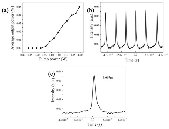 (a) The average output powers versus pump powers; (b) the passive Q-switching laser pulse train; (c) a typical pulse shape of 1.667 μs width.