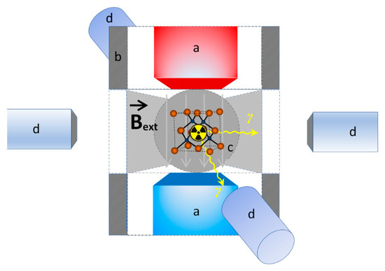 Schematic diagram of the magnetic field setup (0.48 T): Semiconductors doped with a radioactive isotope were placed in a uniform magnetic field, where (a) represents the permanent magnets, (b) is an iron casing to shield the magnetic field, (c) is the position of the sample, and (d) are the detectors.