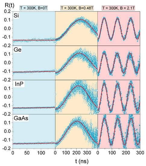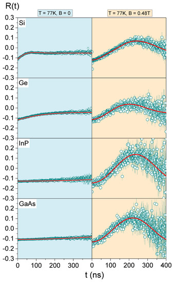 For measurements under the magnetic field, the samples were mounted into the 0.48 T magnet as shown in Figure 1 and then placed in liquid nitrogen (77 K). The PAC spectra and fits of the annealed samples are presented in Figure 3. The Larmor frequencies (ωL) and dynamic quadrupole frequencies (ω0) are given in Table 4. They are practically identical with those at room temperature. Thus, no additional effect on the magnetic interaction is observed. The crystal yields the same numbers. For GaAs and InP, no dynamic electric interaction is observed for all measurement temperatures (ω0 ≈ 0) [7] and, therefore, only the magnetic interaction is considered. For Si, a small contribution of a quadrupole frequency is measured at 77 K under the application of the external magnetic field: ω0(Si) ≈ 4 Mrad/s. No quadrupole interaction is found for Ge: ω0(Ge) = 0 Mrad/s (without an external magnetic field: ω0(Si) ≈ 15 Mrad/s and ω0(Ge) ≈ 3 Mrad/s). The corresponding R(t) spectra are shown in Figure 3 (beige layer). The dynamic interaction does not contribute to the spectra significantly under the magnetic field. As we can only access a finite time in this type of measurement, the effect of electronic re-arrangement may be hidden in the statistical background at long measurement times.