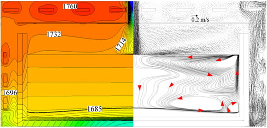 The flow pattern of silicon melt and argon gas significantly affects the distribution of impurities during the casting of silicon. Figure 3 shows the heat transfer and flow of argon and silicon melt in a conventional furnace. Argon gas is ejected from the argon tube above the free surface at a flow rate of 30 L·min−1 and then it sweeps along the free surface to the crucible. A part of the argon flows out of the crucible away from the silicon area, and another part forms a reflux, then flows back to the free surface along the cover. The flow of argon also changes the position of the isotherm above the free surface.
