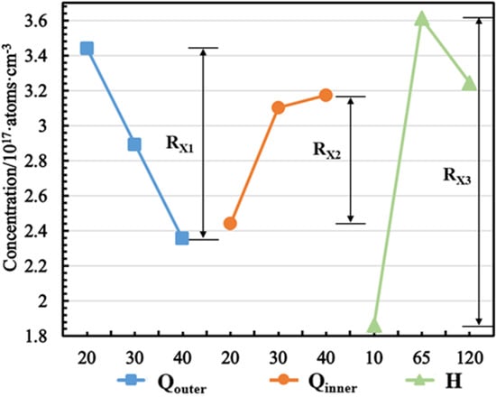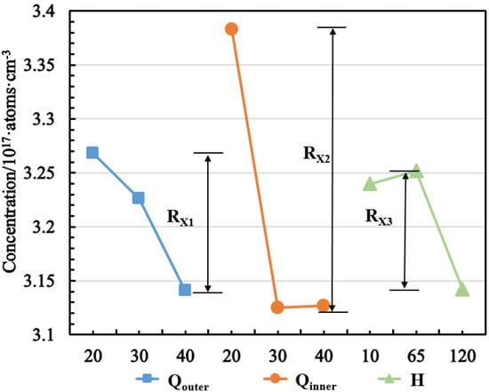 Figure 4 and Figure 5 reflect the degree of influence on the evaluation indices when the levels of Qouter, Qinner, and H are changed. As can be seen from Figure 4, when the average concentration of O in a completely crystallized silicon ingot is the index, the relative degree of influence of each factor on it is RX2 > RX1 > RX3, that is, Qinner has the largest influence on the O concentration in this study followed by Qouter and H. This is because in the process of crystal growth, O atoms in the silicon melt continuously combine with silicon atoms to form SiO, which makes the free surface become the source of SiO. Compared with the argon flowing out of the outer tube, argon flowing out of the inner tube can directly reach the free surface of the melt under gravity, and its maximum velocity is at the bottom, so it can sweep the whole free surface and take away the evaporated SiO.