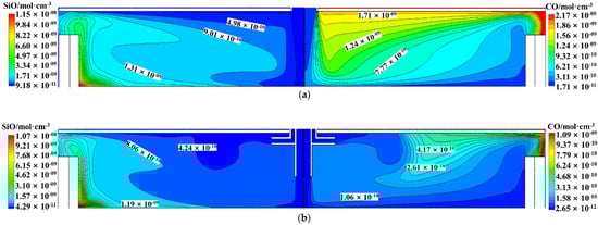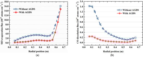 Figure 7 shows the concentration distributions of SiO and CO above the free surface at 50% crystalline fraction with and without the AGDS. Figure 8 presents the evaporation flux of SiO and the dissolution flux of CO at this stage. It can be found that the convection and diffusion of SiO above the free surface are significantly suppressed because of the outflow of the outer tube, and the evaporation flux of SiO above the free surface is decreased. Because less SiO reaches the cover, the production of CO is decreased. At the same time, the continuous flow of the outer tube also obviously suppressed the chemical reaction at the cover, thus significantly decreasing the dissolution flux of CO at the free surface.