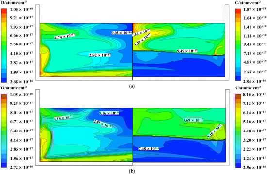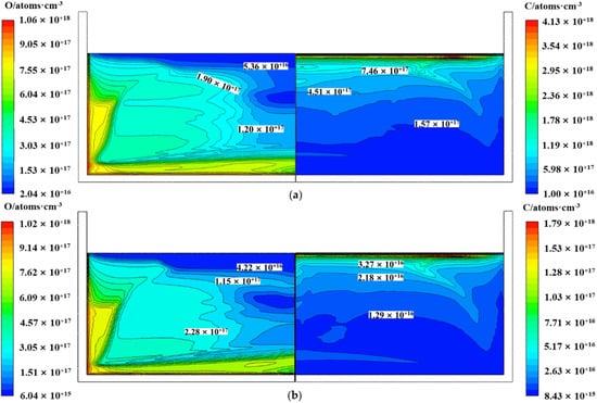 From Figure 10a we found that the configuration of AGDS has little influence on the concentration of O in the silicon region, and also has no significant influence on the distribution of O at the 50% crystalline fraction because, although the evaporation flux of SiO decreases, which means that fewer O atoms leave the silicon melt, it also reduces the O atoms that CO decomposes into the melt. However, the configuration of AGDS has a significant effect on the concentration of C in the silicon region, but the maximum concentration of C in the silicon melt decreases significantly. In the silicon melt, the maximum C concentration appears at the center of the melt without the AGDS. When AGDS is used, the maximum value of the C concentration only appears at the c-m interface. Meanwhile, as shown in Figure 10b, the C concentration decreased significantly along the central axis of the silicon region. As mentioned above, this is because the outflow of the outer tube suppresses the generation of CO and decreases the dissolution flux of CO at the free surface, thus decreasing the concentration of C in the silicon melt.