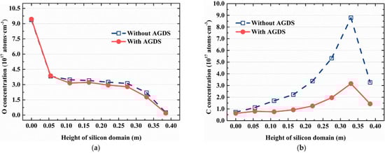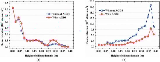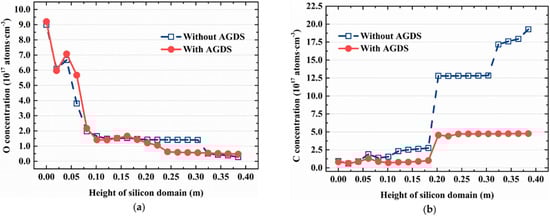 To clarify the influence on the change of the average O and C concentrations in the fully crystallized silicon ingot with and without the AGDS, the average O and C concentrations of the radial cross-lines at different ingot heights were calculated respectively. The distribution of concentration along the height of the silicon ingot is shown in Figure 13. It can be seen that the radial average O concentration also gradually decreases with an increase in the height of the silicon ingot. On the one hand, this is because it is gradually farther away from the pollution source, the quartz crucible at the bottom, and, on the other hand, the segregation coefficient of O is relatively large. The radial average concentration of C also shows the same trend as the concentration along the central axis of the silicon ingot, and the reason for this trend is similar to that of O. On the one hand, this is due to the free surface becoming closer. On the other hand, the segregation coefficient of C is very small. The radial average O concentration of the silicon ingot with the AGDS is lower than that without the AGDS and the radial average C concentration of the silicon ingot decreases more obviously. This indicates that the concentration of O and C in the radial direction of the silicon ingot can be effectively reduced by using the AGDS. Through the calculation of the average O and C concentration of the entire silicon ingot, we found that if the AGDS with the optimized parameter combination is adopted, the average concentration of O and C in the silicon ingot is decreased by about 7.5% and 59.9%, respectively. This means that the AGDS with optimized parameters can effectively reduce the concentrations of O and C in silicon ingots, especially C.