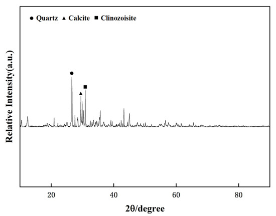 Iron tailing sand comes from Lizhu tailings pond in Shaoxing, China. It is composed of gray black particles, and its main chemical components are shown in Table 3. Through the XRD test, it is found that the main mineral composition of iron tailings is quartz, calcite, clinopyrochlore, etc., as shown in Figure 1.