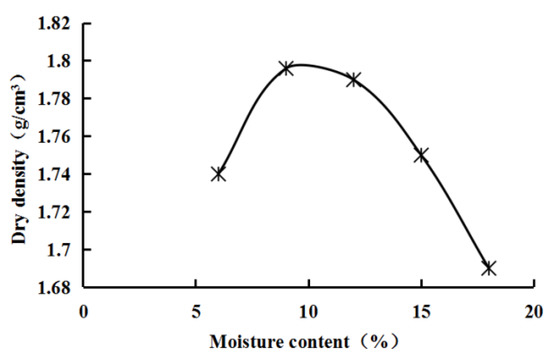 In this study, the proportion and dosage of lime and fly ash are fixed. According to the Chinese technical rules for construction of highway pavement base (JTGT F20-2015) [17], the mass ratio of materials is determined as Lime: Fly Ash: Clay: Iron Tailings = 5:15:16:64. The optimal moisture content obtained through the compaction test is 9.8%, as shown in Figure 2.