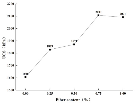 Before the beginning of this study, the authors added polypropylene fiber with different dosage (0%, 0.25%, 0.5%, 0.75% and 1% of dry soil mass) to the lime fly ash iron tailings to conduct the unconfined compressive strength test, so as to determine the optimal dosage of fiber. In order to reduce the test error, six samples are made for each group, and the average value is taken. The test results are shown in Figure 3. It can be seen that the UCS of FEIT first increases and then decreases with the increase in fiber content. When the fiber content is 0.75%, the UCS reaches the maximum value of 2107 kPa. This is because, with the increase in fiber content, the spacing between fibers in the sample becomes smaller and smaller, the fibers are intertwined to form a stress network, and the strength of the soil increases. However, if the fiber content continues to increase, i.e., when the fiber content is greater than 0.75% in this test, the phenomenon of fiber agglomeration and uneven distribution will appear in the sample. Thus, the stress structure between fiber and soil is affected, so the strength decreases. Therefore, the optimal fiber content is 0.75%. See Table 6 for the specific test scheme.
