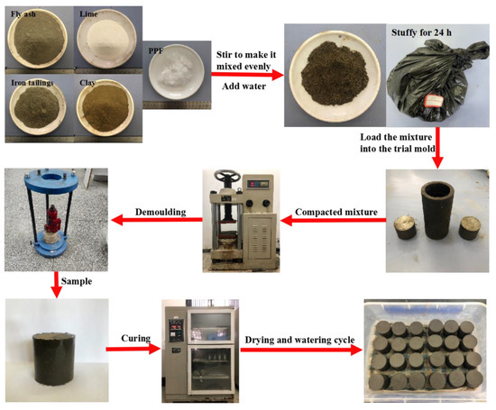- The iron tailings and clay were dried and crushed, and then passed through a 2 mm sieve plate to obtain iron tailings and clay less than 2 mm. We weighed a certain proportion of lime, fly ash, fiber, clay and iron tailings according to the test scheme, mixed the dry mixture evenly, and then added water to mix evenly to obtain the mixture, and put the mixture into plastic bags for 24 h.