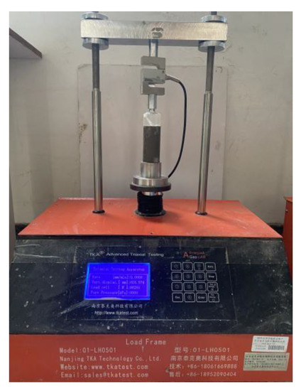 We conducted the unconfined compression test on the FEIT samples after dry–wet cycles. The test instrument was a fully automatic multi-functional unconfined compression instrument produced by Nanjing TKA Technology Co., Ltd. (Nanjing, China), as shown in Figure 5. In order to minimize human or test errors, the UCS test should be conducted on at least five samples in each group. During this test, in order to avoid end effects, epoxy resin indenter is placed on the upper end of the sample [19], and the loading rate is set to 1 mm/min.