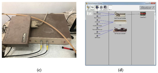 Dynamic triaxial tester. (a) Triaxial pressure chamber and power driver; (b) confining pressure and back pressure controller; (c) data acquisition system; (d) software control system.