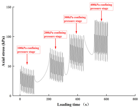 In practical engineering, as a subgrade material, FEIT will be affected by the dynamic traffic load; it is very important to study the dynamic characteristics of FEIT after dry–wet cycles. We conducted a dynamic triaxial test on EIT and FEIT after dry–wet cycles, and the confining pressures were 100 kPa, 200 kPa, 300 kPa and 400 kPa. The instrument used in the test was the dynamic triaxial instrument produced by GDS Company in the UK. The instrument is composed of six parts: triaxial pressure chamber, confining pressure controller, back pressure controller, data collector, power driver and control system, as shown in Figure 7. The displacement control method is adopted in the test. After debugging, the displacement is 0.05 mm, the frequency is 1 Hz [20], and the loading waveform is sinusoidal. The loading time axial stress curve is shown in Figure 8.