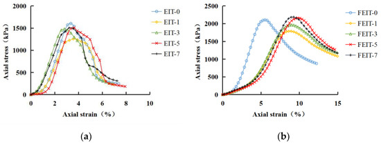 The stress–strain curves of EIT and FEIT under axial load after dry–wet cycles are shown in Figure 10.